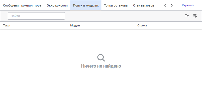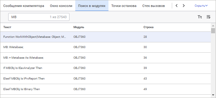 После нажатия на кнопку «Найти все» или клавиши ENTER будет осуществлён поиск. Результаты поиска будут отражены в окне «Результаты поиска», которое располагается в нижней части окна среды разработки.