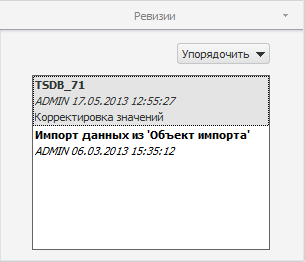 Для сортировки ревизий используйте раскрывающееся меню кнопки «Упорядочить». Доступна сортировка ревизий по наименованию или по дате создания (используется по умолчанию).