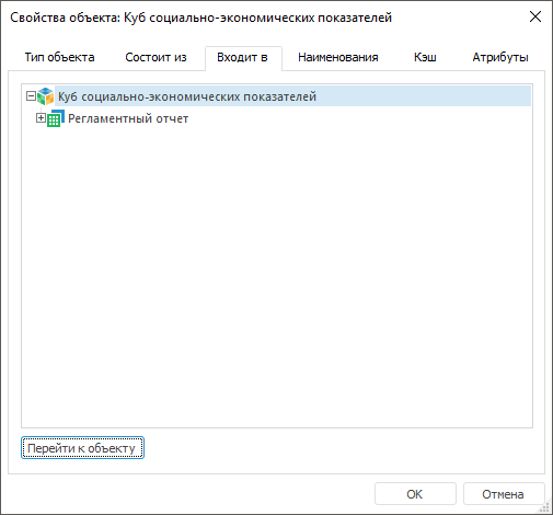На вкладке «Входит в» содержится иерархия объектов, которые ссылаются на текущий объект. Функция позволяет выполнять анализ влияния изменений для источников данных. Например, для таблицы отображаются измерения, кубы и отчёты, построенные на основе данных из этой таблицы.