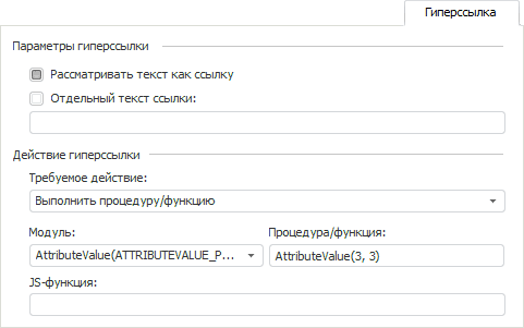 Для ячейки в регламентном отчете откройте окно «Формат ячейки», перейдите на вкладку «Гиперссылка». Если был создан и подключен модуль, то выберите его в поле «Модуль» и укажите вызов процедуры в поле «Процедура/функция». Если создавалась JavaScript-функция, то укажите её вызов в поле JS-функция.