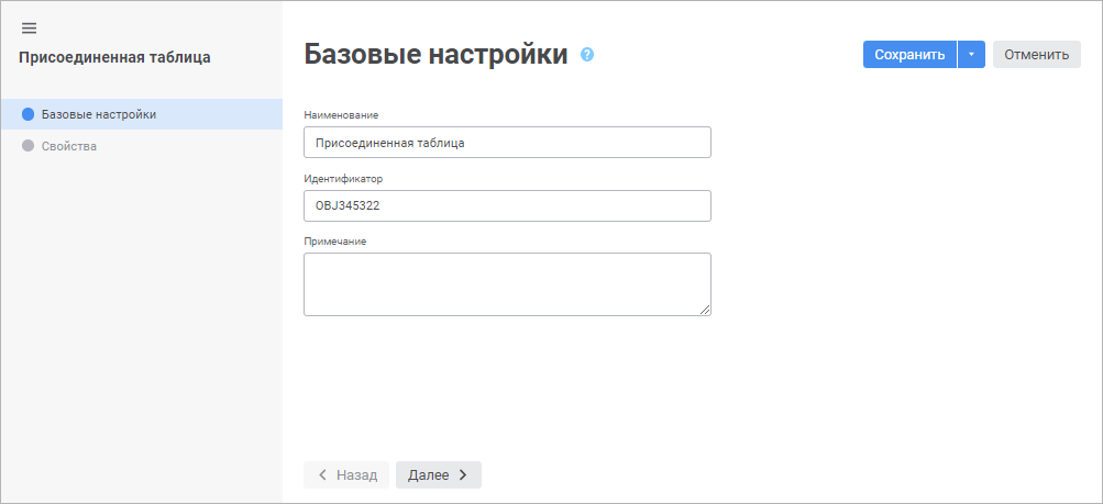 На странице «Базовые настройки» в веб-приложении и «Базовые свойства» в настольном приложении задаются наименование объекта, идентификатор и примечание.