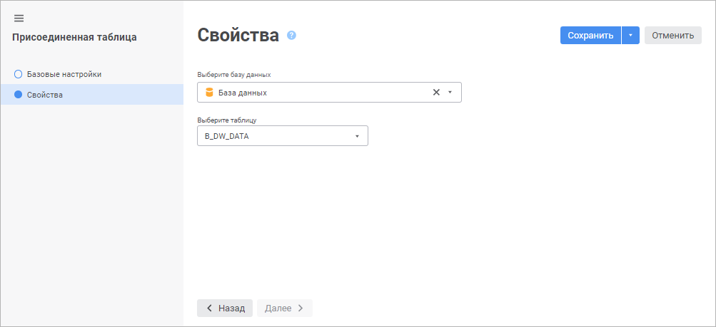 На странице «Свойства/Выбор базы данных» укажите базу данных, содержащую таблицы, на основе которых требуется создать новые присоединенные таблицы репозитория.