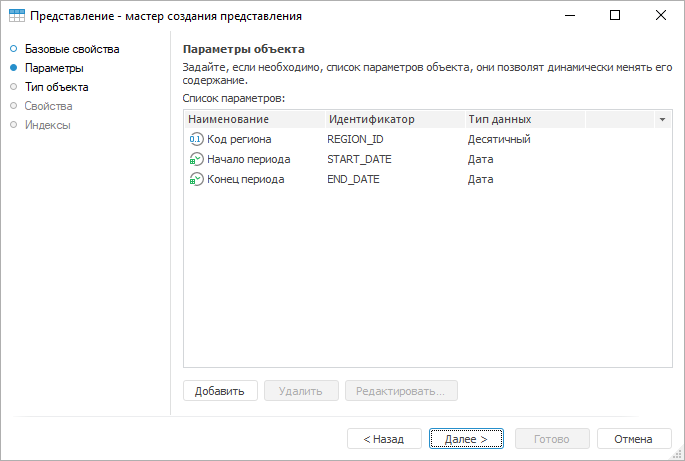 На странице «Параметры» задаётся список параметров объекта. Параметры позволяют формировать содержимое объекта динамически: