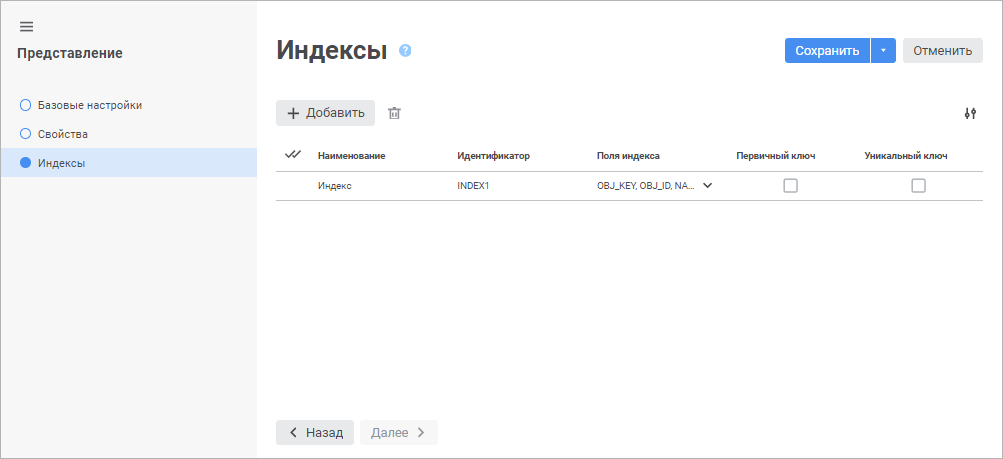 Идентификатор. Введите уникальный идентификатор индекса в списке индексов представления (допускается использование только латинских букв, цифр и знаков «_», не допускается использование пробелов). По умолчанию формируется как <Идентификатор представления>_INDEX<Порядковый номер индекса>;