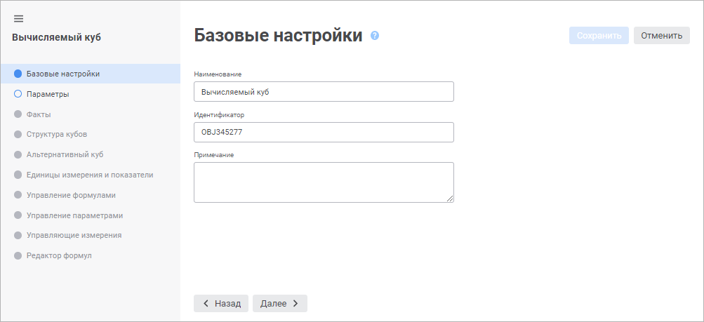 На странице «Базовые настройки» в веб-приложении и «Базовые свойства» в настольном приложении задаются наименование объекта, идентификатор и примечание.