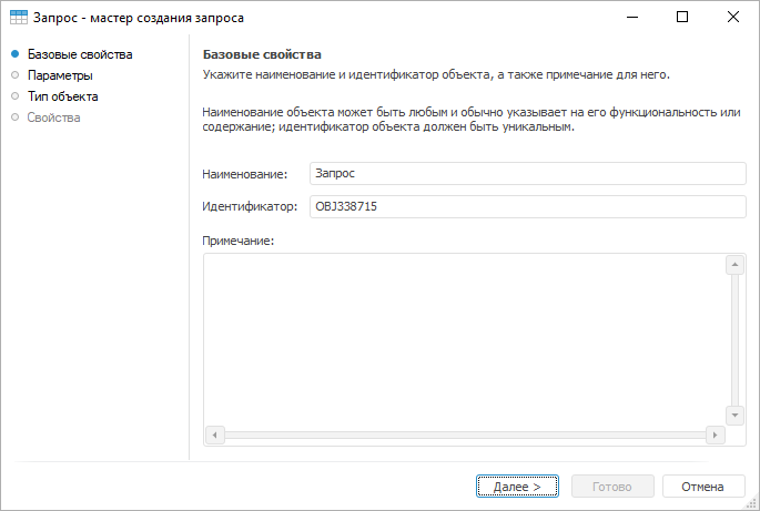 На странице «Базовые настройки» в веб-приложении и «Базовые свойства» в настольном приложении задаются наименование объекта, идентификатор и примечание.