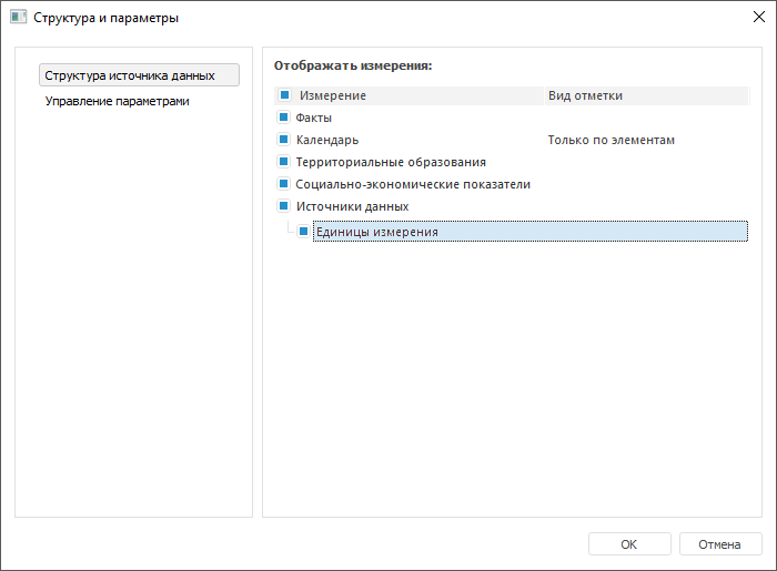 В группе вкладок «Отметка» боковой панели будет отображено измерение «Социально-экономические показатели.Единицы измерения», построенное по значениям атрибута «Единицы измерения»: