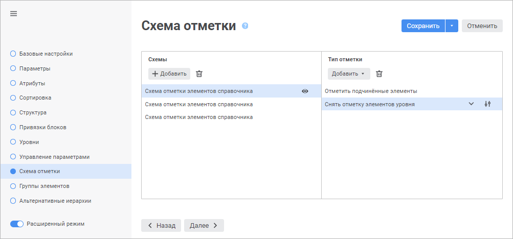 Примечание. Для справочников НСИ работа ведется только с основными элементами справочника. При этом отсутствует возможность создания схем отметки на элементах альтернативных иерархий, установленных по умолчанию.