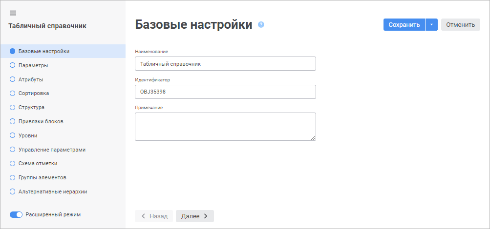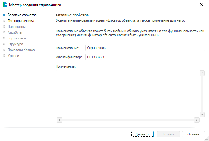 На странице «Базовые настройки» в веб-приложении и «Базовые свойства» в настольном приложении задаются наименование объекта, идентификатор и примечание.