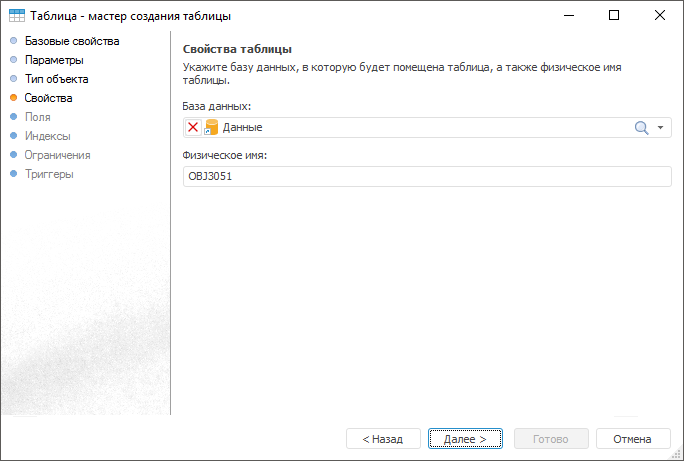 На странице «Свойства» определяется база данных, в которой будет создана таблица, а также физическое имя. Физическое имя таблицы - имя, с которым она будет создана в выбранной базе данных. В качестве физического имени таблицы по умолчанию предлагается использовать идентификатор таблицы.