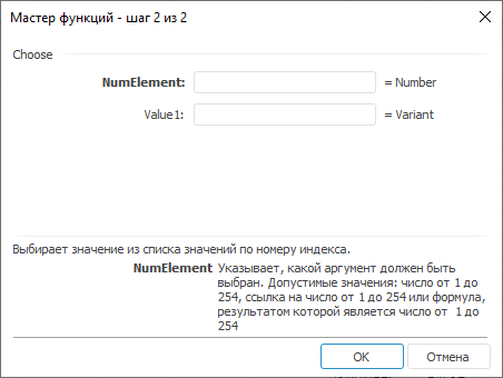 =Choose(2, "первый", "второй", "третий") второй Выбор второго значения из заданных.