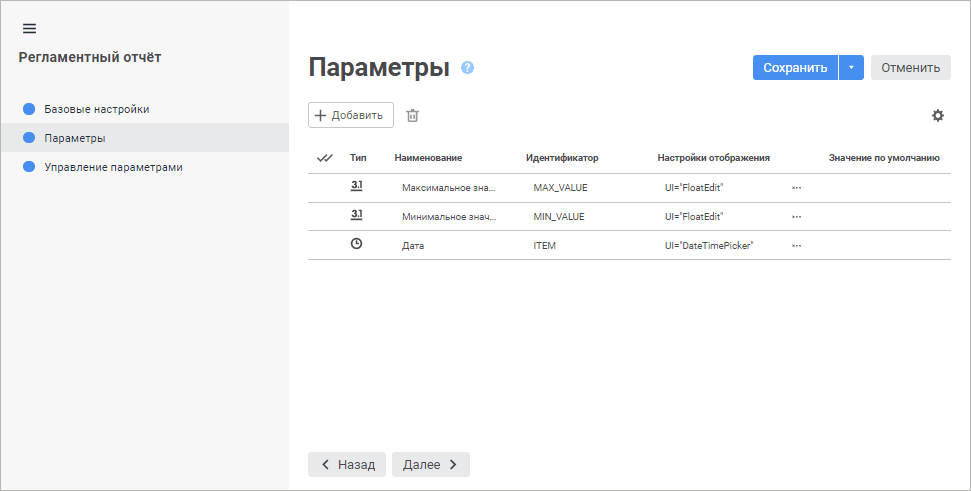 Параметры отчёта позволяют динамически управлять данными, отображаемыми в отчёте. Для формирования списка параметров предназначена страница «Параметры» мастера настроек отчёта.