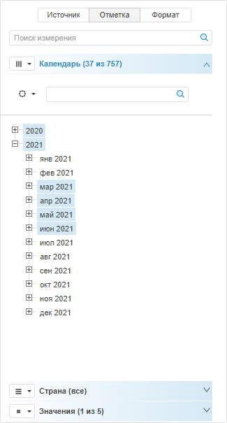 Примечание. Комбинирование измерений доступно в инструментах «Аналитические панели» и «Аналитические запросы (OLAP)».