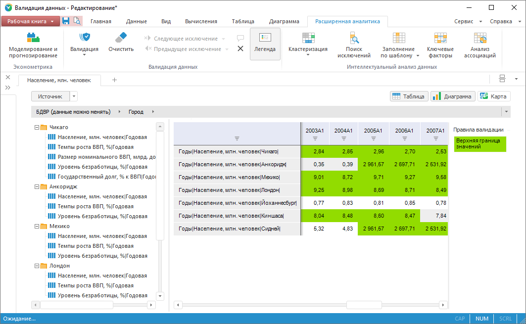 исключения выгружаются на новый лист, если правило валидации выполнялось в текущей БД временных рядов рабочей книги. Ряды, в которых содержатся исключения, доступны в дереве рядов нового листа. Дополнительно исключения сохраняются в виде дочернего объекта для правила валидации и доступны на вкладке боковой панели «Правила валидации». Формат наименования объекта: Запуск <дата и время запуска>. Например: Запуск 01.03.2018 15:45:00.