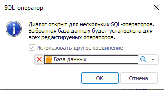Следует выбрать базу данных из объектов репозитория. Выбранная база данных будет установлена для всех редактируемых SQL-операторов.