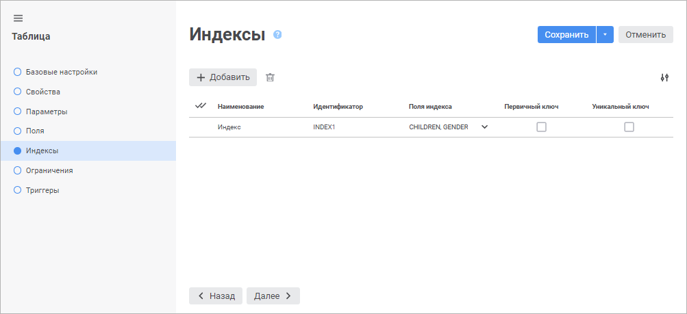 На странице «Индексы» задаётся список индексов таблицы. Индексирование обеспечивает быстрый поиск и выборку значений, а также соблюдение уникальности значений определенных полей. Часто поиск осуществляется по различным полям или группам полей. В таких случаях есть смысл создавать несколько индексов.