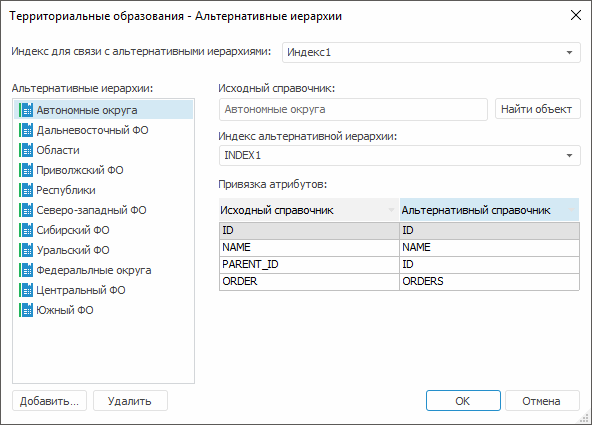 В области «Альтернативные иерархии» добавьте справочник НСИ «Федеральные округа». Для этого: