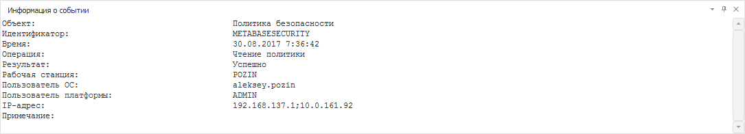 Для просмотра информации о событии в разделах «Протокол доступа» и «Мониторинг нарушений защиты» используйте окно «Информация о событии»: