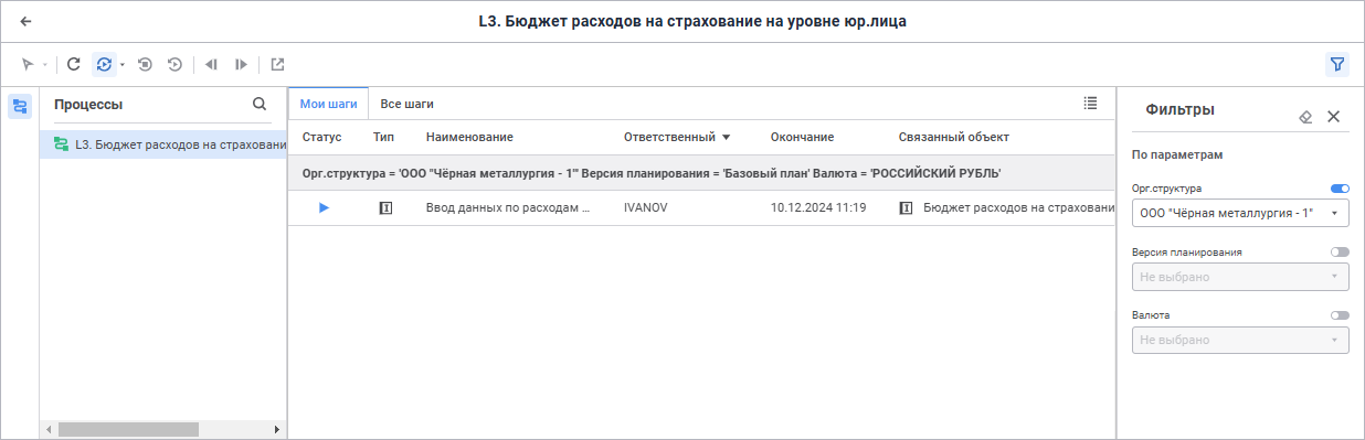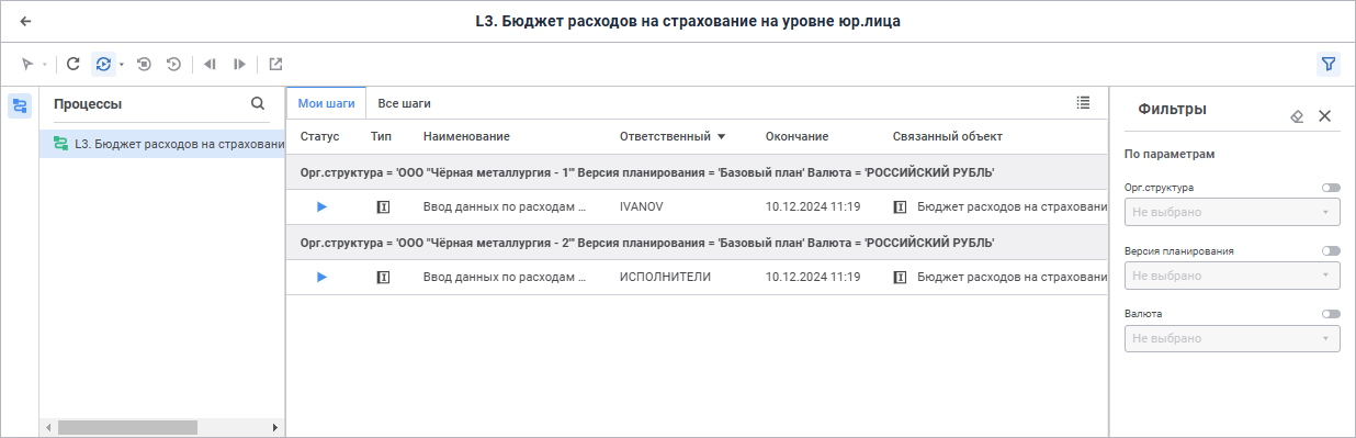 В пользовательском мониторинге при отображении в рабочей области списка шагов процесса, назначенных пользователю для выполнения, на вкладках «Мои шаги» и «Все шаги» .