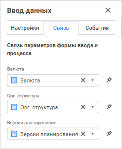 Для открытия формы ввода/отчёта с теми же параметрами, что и запущенный шаг процесса, выполните настройку связи параметров формы ввода/отчёта и процесса на вкладке «Связь» панели параметров шага: