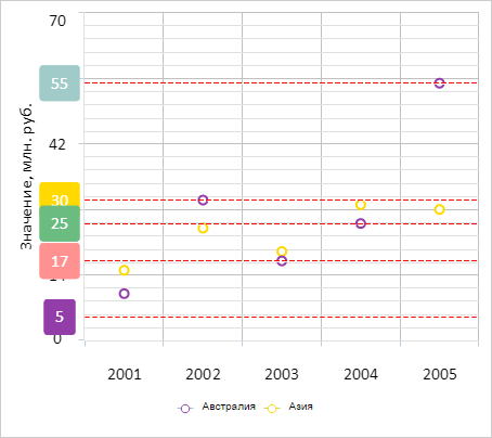 В результате выполнения примера для каждой точки первого ряда данных были отрисованы линии оси Y. Также специально была нарисована линия для значения 5: