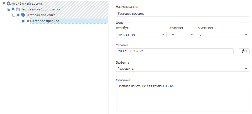 В результате выполнения примера в менеджере безопасности будет активировано использование атрибутного доступа, добавлена заданная структура атрибутного доступа с определенными параметрами политики и правила для разрешения доступа на чтение объекта группе пользователей с наименованием «USERS»:
