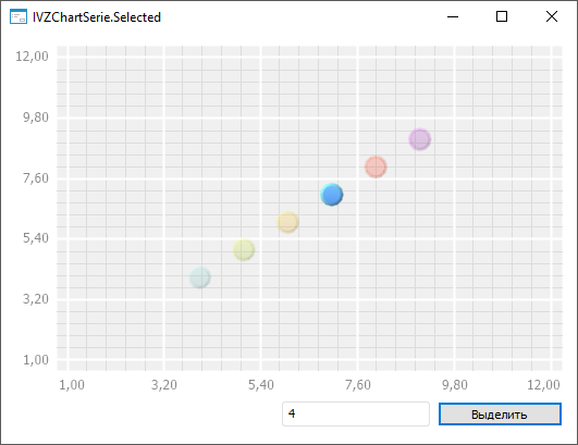 После выполнения примера щелкните левой кнопкой мыши на область пузырьковой диаграммы, задайте индекс ряда данных в компоненте EditBox и нажмите кнопку «Выделить». В результате чего будет выделен ряд данных с указанным индексом, например: