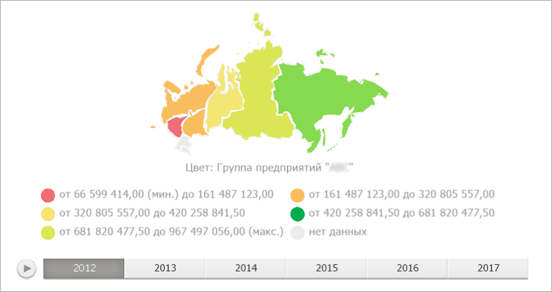 Карта - объект, предназначенный для отображения данных из источника в виде карты территорий с детализацией необходимых характеристик по отдельным регионам. Например: