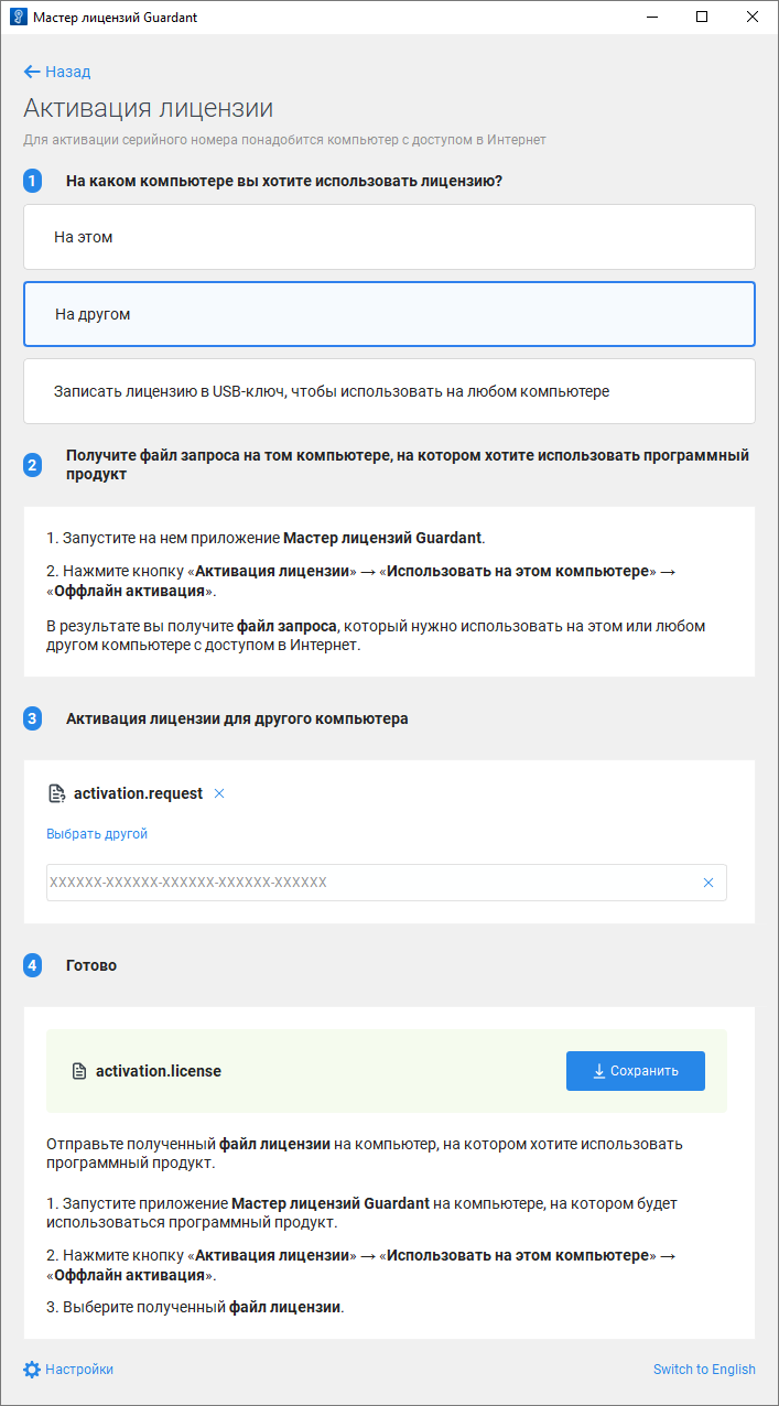 После выполнения действий будет сохранён файл лицензии с расширением *.license. Передайте сформированный файл на компьютер, на котором был сохранён файл запроса на активацию лицензии, и активируйте лицензию с помощью файла.