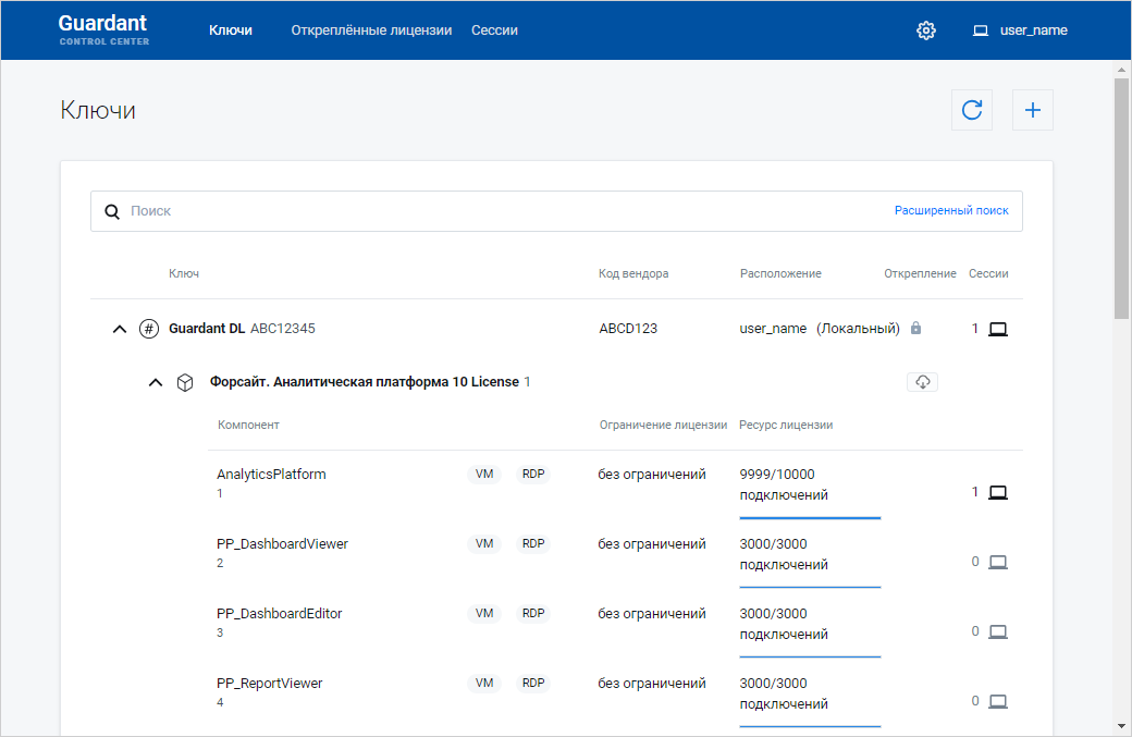 Для работы с лицензией используйте раздел «Ключи». В разделе содержатся лицензии, активированные в мастере лицензий Guardant, с набором единиц лицензирования (компонентов):