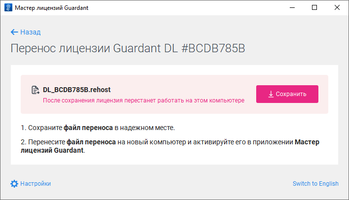 Лицензия доступна для переноса на другой компьютер в мастере лицензий Guardant в графическом или консольном режиме.