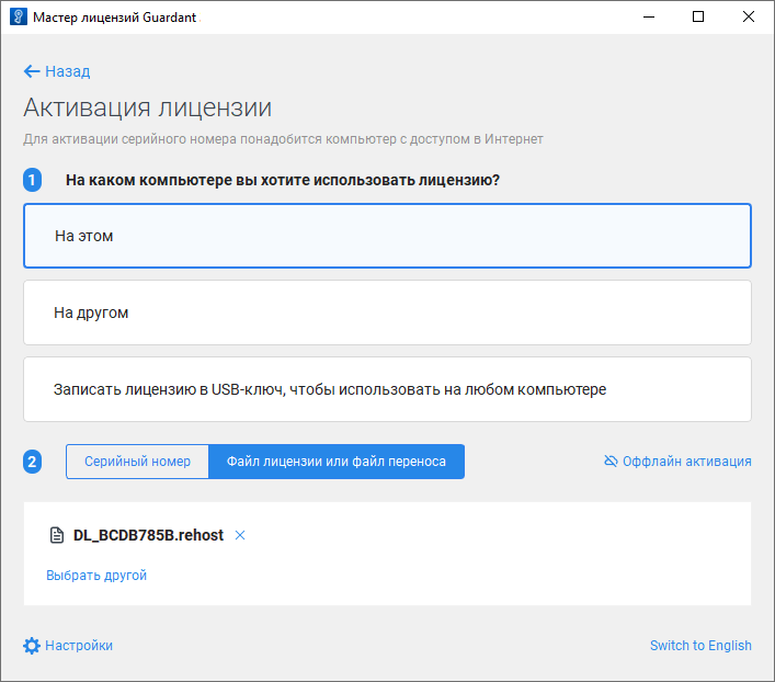 Активируйте лицензию с помощью файла переноса лицензии на другом компьютере:
