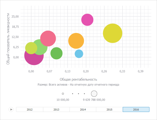 Дополнительно в продукте «Форсайт. Аналитическая платформа» пузырьковая диаграмма содержит анимированную временную шкалу, отображающую динамику значений.