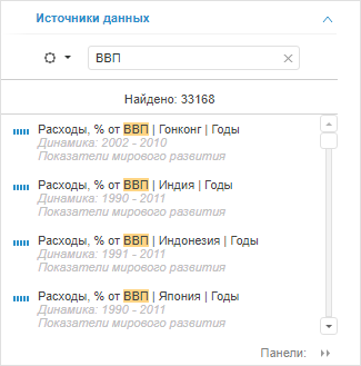 BI-поиск источников данных по их содержимому. Доступен, если выполнены соответствующие настройки. Подробнее см. разделы: «Установка сервиса BI-поиска» и «Как подключить BI-поиск для аналитических панелей в веб-приложении?».