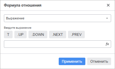 Выражение. Результатом применения отношения будет элемент, индекс которого вычисляется по заданному выражению. Выражение задается с помощью кнопок, расположенных рядом с полем ввода, или с помощью редактора выражения. Составление выражения требуется начинать с текущего элемента измерения, для этого используйте кнопку «Т». Далее можно указать смещение, например: T.PREV, T.PREV.UP, T.UP.NEXT и т.д. Для составления выражения используйте кнопки: