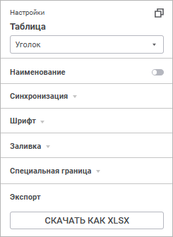 Для отключения отображения уголка таблицы переведите переключатель «Наименование» в неактивное состояние.