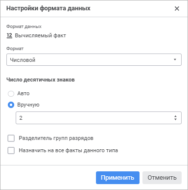 Факты. Содержит поля целого и вещественного типов модели данных, а также вычисляемые факты и вычисляемые поля. Отображается, если в качестве источника данных информационной панели выбрана модель данных;
