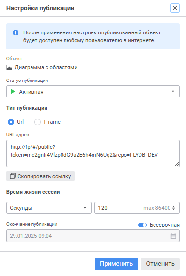 Примечание. Публикация объектов доступна только пользователям, имеющим права администратора. Опубликованные объекты доступны во внешних источниках без авторизации любым пользователям в интернете.