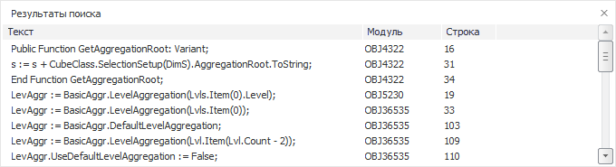 В окне «Результаты поиска» в настольном приложении и на панели «Поиск в модулях» в веб-приложении отображаются результаты поиска по коду модулей репозитория.