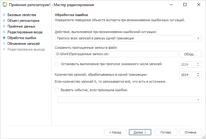 При выборе действий «Пропуск только некорректных записей» или «Пропуск всех записей в рамках одной транзакции» доступно указание файла для сохранения пропущенных записей.