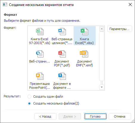 Выберите формат файла и результат экспорта. Если выбран формат Книга Excel (*.xls), доступно сохранение вариантов отчёта в несколько файлов. При выборе других форматов, варианты отчёта можно сохранить как в одном файле, так и в нескольких.