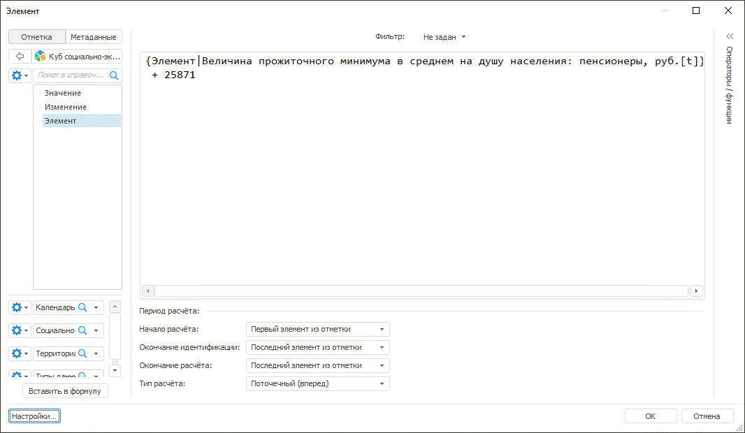 В результате при нажатии на кнопку «Button1» будет выведен диалог редактора выражений вычисляемого элемента экспресс-отчета, в котором располагается формула элемента с возможностью её редактирования: