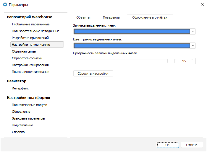 Примечание. В веб-приложении в настройках по умолчанию доступно задание объектов репозитория и настройка оформления в отчётах.