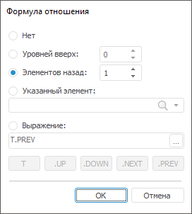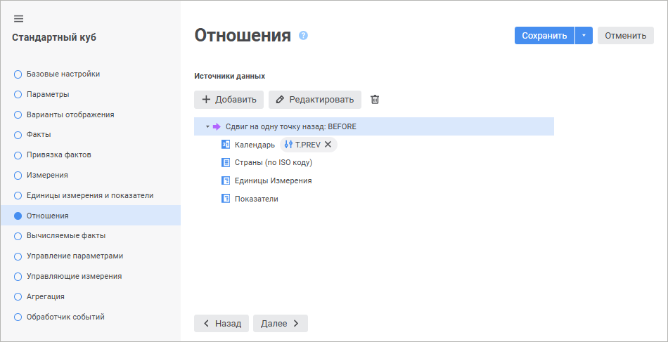 Отношения позволяют получать значения фактов путём смещения относительно текущей точки расчёта. Используются при формировании выражений вычисляемых фактов куба.