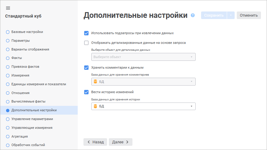 На странице «Дополнительные настройки» в веб-приложении настраиваются параметры для работы с данными стандартного куба.