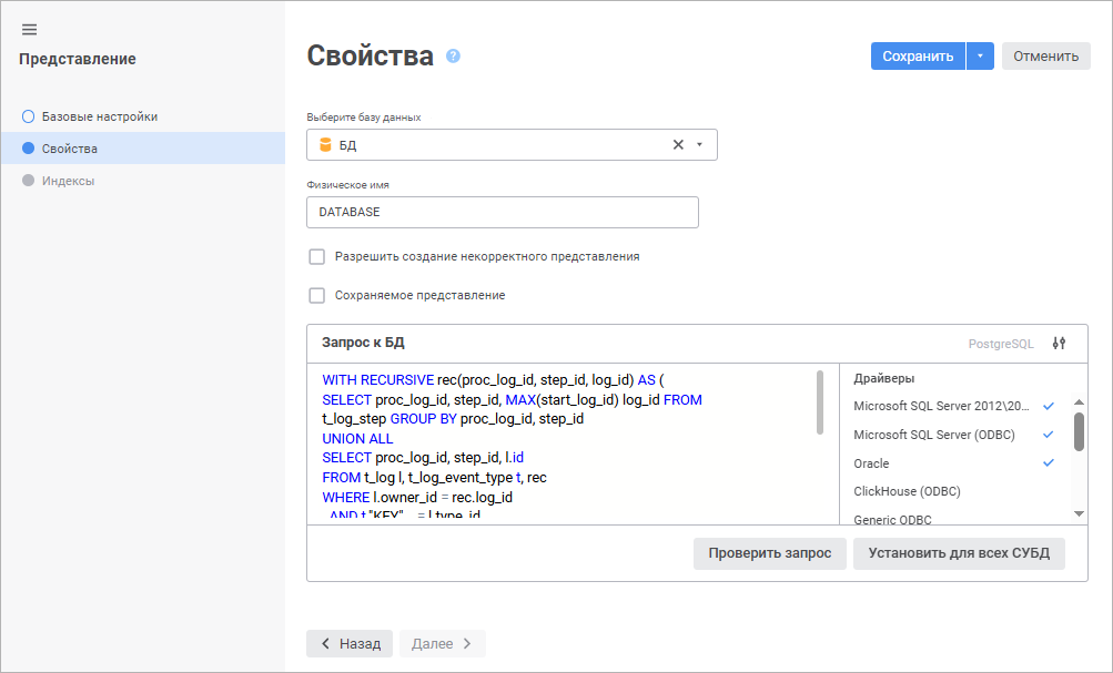 Драйвер. В раскрывающемся списке выберите тип драйвера. Более подробно о доступных драйверах читайте в подразделе «Поддерживаемые СУБД». В списке «Драйвер» по умолчанию отображается драйвер, который используется в выбранной базе данных. При необходимости можно выбрать другой драйвер и указать для него текст SQL-запроса. Параметр актуален, если репозиторий будет использоваться на серверах с различными СУБД и настройки базы данных в репозитории будут изменены;
