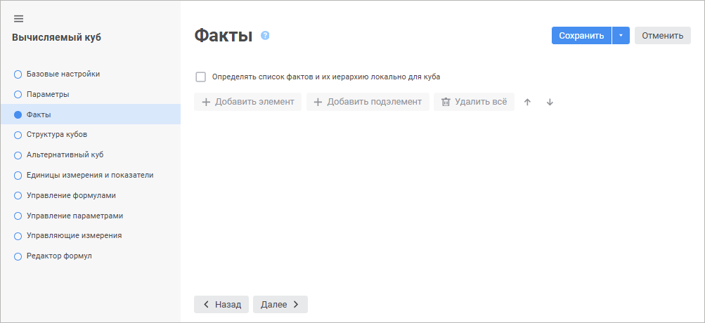 На странице «Факты» определяется список и иерархия фактов куба. Измерение фактов может быть задано локально или как измерение фактов куба-источника.