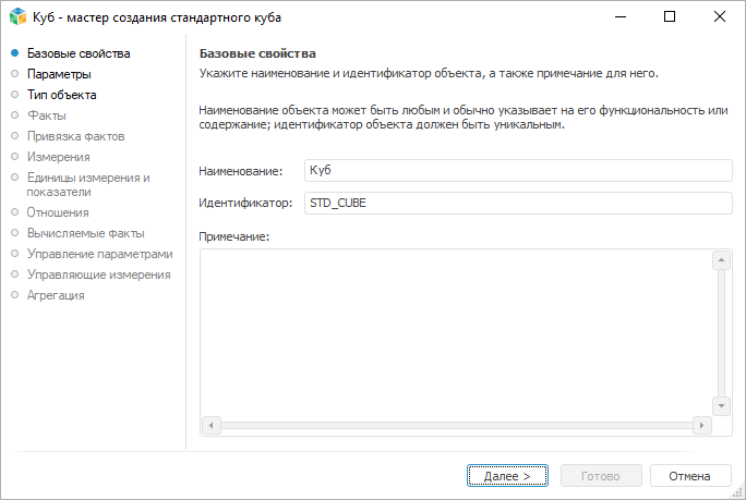 На странице «Базовые настройки» в веб-приложении и «Базовые свойства» в настольном приложении задаются наименование объекта, идентификатор и примечание.