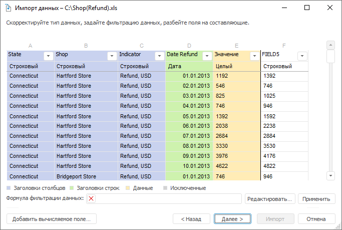 Для преобразования данных, которые были получены из источника данных и в дальнейшем будут импортированы в приёмник, перейдите на страницу корректировки данных мастера импорта данных: