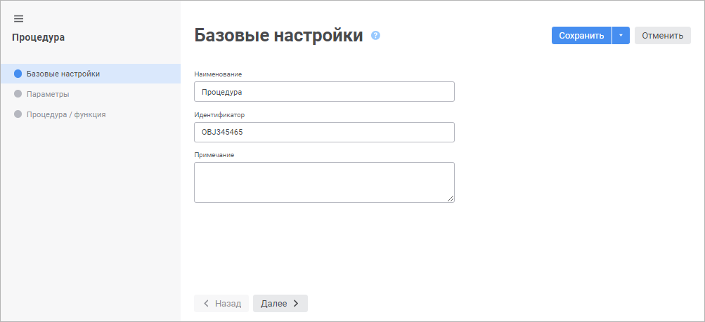 На странице «Базовые настройки» в веб-приложении и «Базовые свойства» в настольном приложении задаются наименование объекта, идентификатор и примечание.